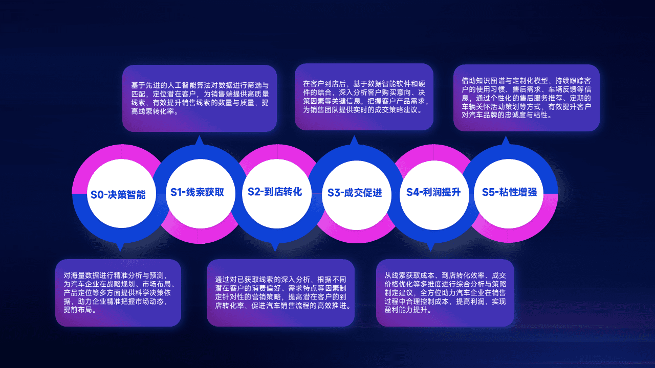 基于销售转化漏斗的薄弱环节,,,,为客户提供数据+模型+运营的智能应用,,,,实现销售业绩的提升;推动线索管理全链路的精细化管理和运营。。。。